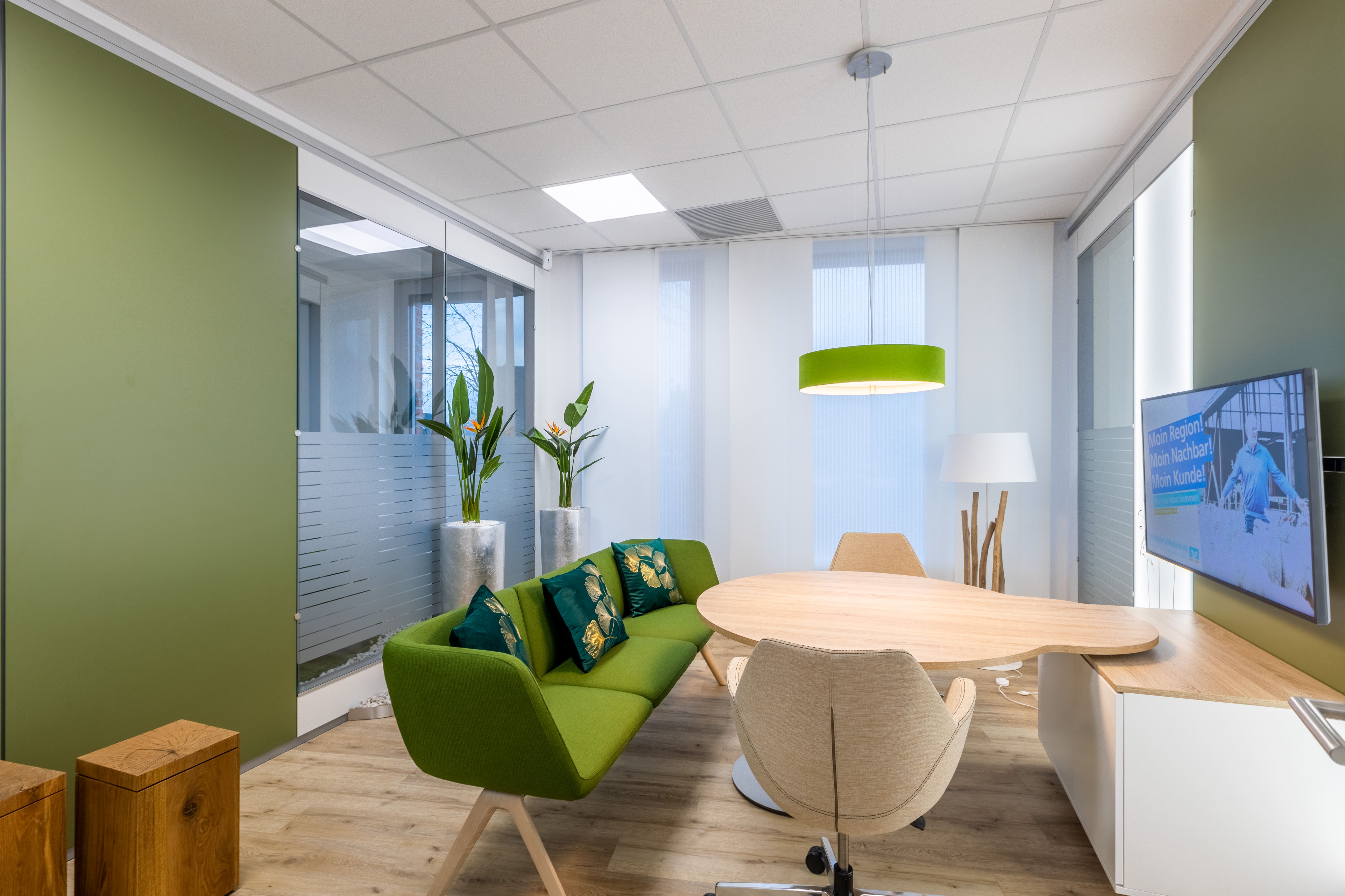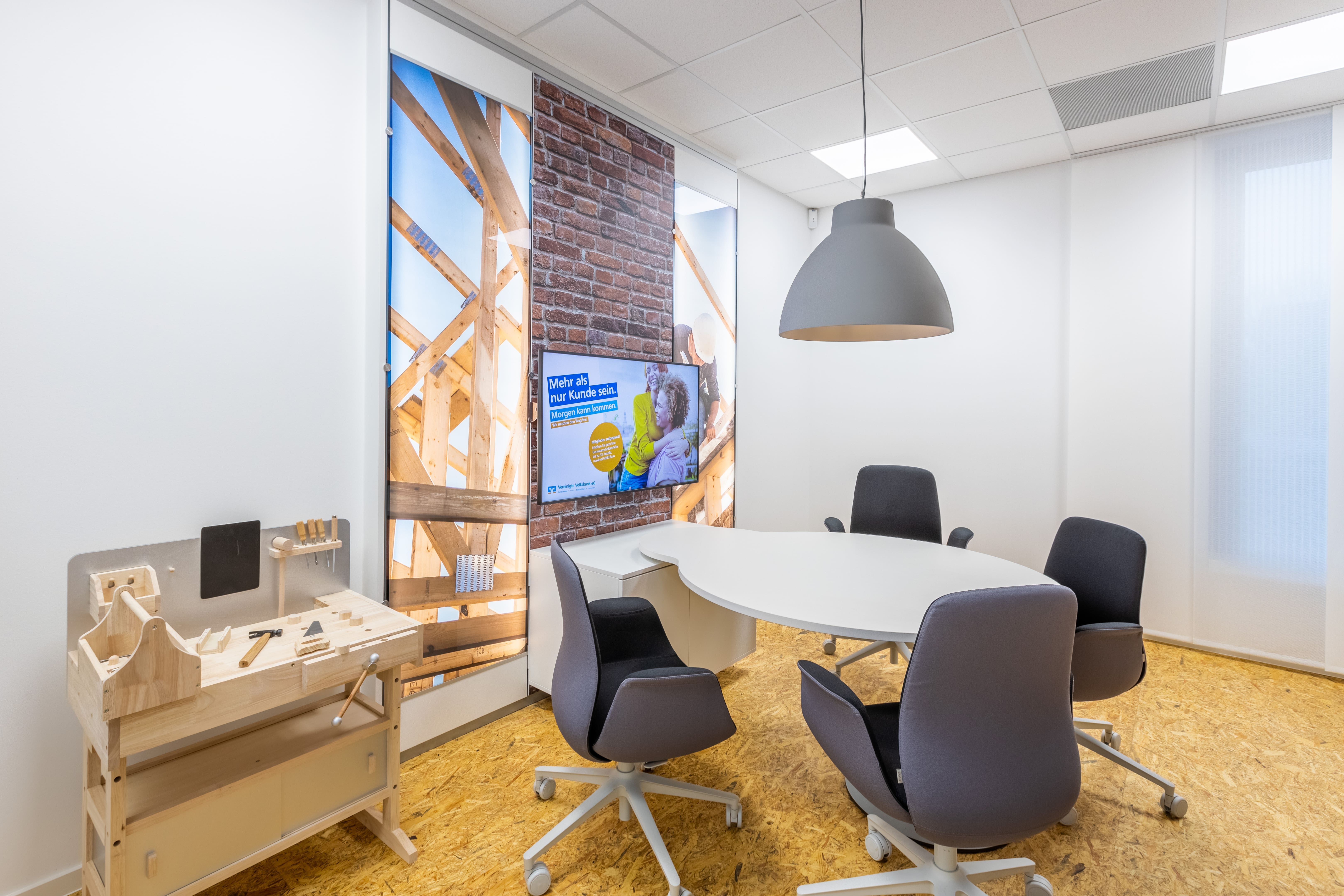 Als Bank ist die Kundenorientierung von entscheidender Bedeutung. Dies wurde bei der Gestaltung des Servicebereichs berücksichtigt. Durch ein einladendes und professionelles Ambiente wird ein positives Kundenerlebnis geschaffen, das die Werte der Volksbank widerspiegelt.