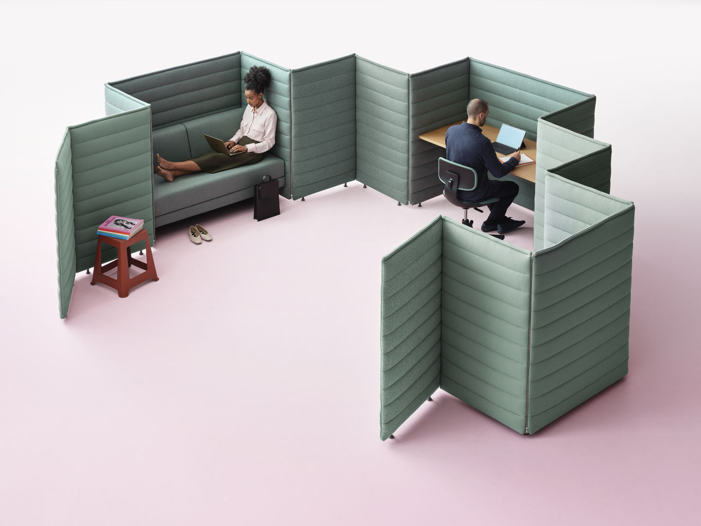 Alcove entstand aus der Zusammenarbeit von Vitra mit den Designern Ronan und Erwan Bouroullec. Seit der Markteinführung 2006 sind die Sofas mit den hohen Rücken- und Seitenpaneelen zum Synonym für moderne, einladende Bürowelten geworden. Oft kopiert aber nie erreicht: Die charismatische Gestaltung und hohe Qualität des Alcove sind bis heute einzigartig. Als eines der ersten Beispiele für Mikroarchitekturen im Büro mit offenem Grundriss war das Sofa als Rückzugsort oder kleiner Besprechungsraum gedacht. Nun haben Vitra und Ronan und Erwan Bouroullec die. Alcove-Familie weiterentwickelt und ergänzt. Mit den mikroarchitektonischen Elementen der neuen Alcove-Produktpalette lassen sich auf offenem Grundriss schnell und einfach vielseitige Bürowelten gestalten. Bauliche Massnahmen sind nicht notwendig.