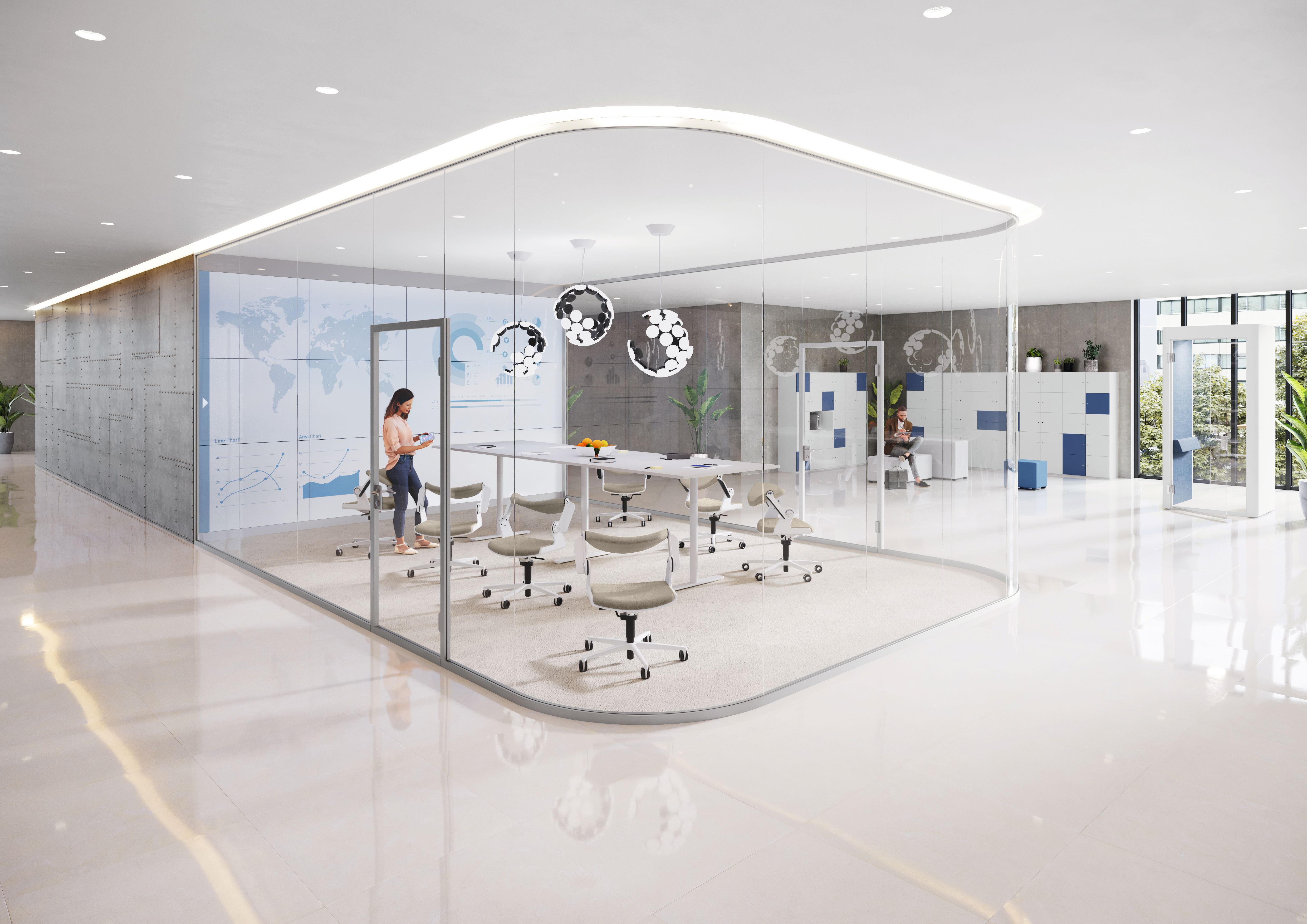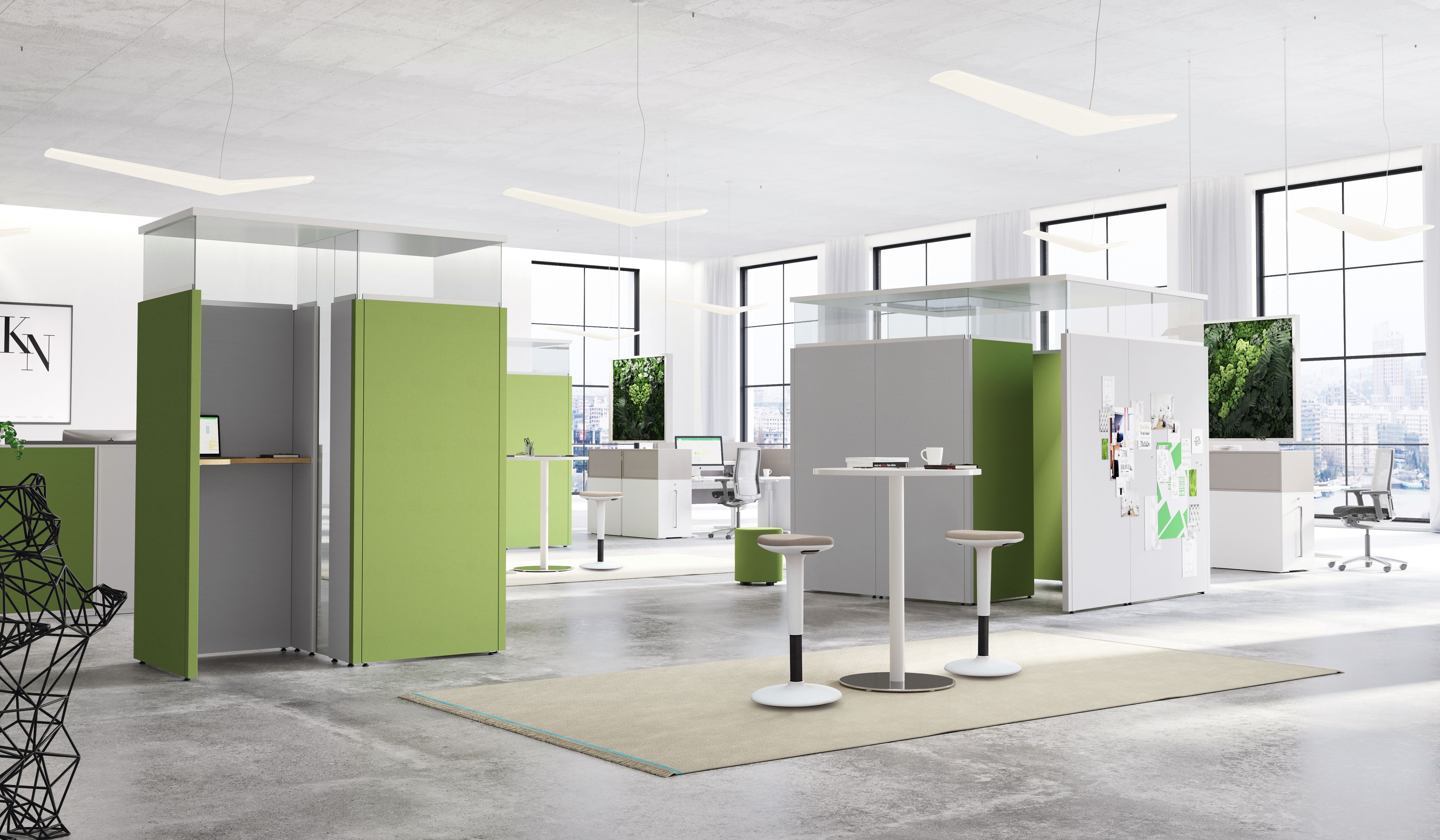Die flexible Arbeitswelt, in der Projektarbeit, Reisen, Home-Office und digitale Abstimmungstools zum Alltag gehören, ermöglicht es, mit Raum systematisch anders umzugehen als früher. Viele Unternehmen entscheiden sich dafür, ihre Büroräume variabel an wechselnde Bedürfnisse anzupassen – und damit Kosten zu senken. Anders als in klassischen Großraumbüros gestalten wir Flächen entsprechend der Arbeitskultur flexibel und modular – und zoniert sie je nach Bedarf mit Raumsystemen in unterschiedlichen Größen und Ausführungen. Vom Glas-Trennwandsystem über Stellwände für konzentriertes Arbeiten, die Telefonkabine oder den wohnlichen Cube zum Besprechen bis hin zur repräsentativen Meetinglösung reicht das Angebot an Raumsystemen.