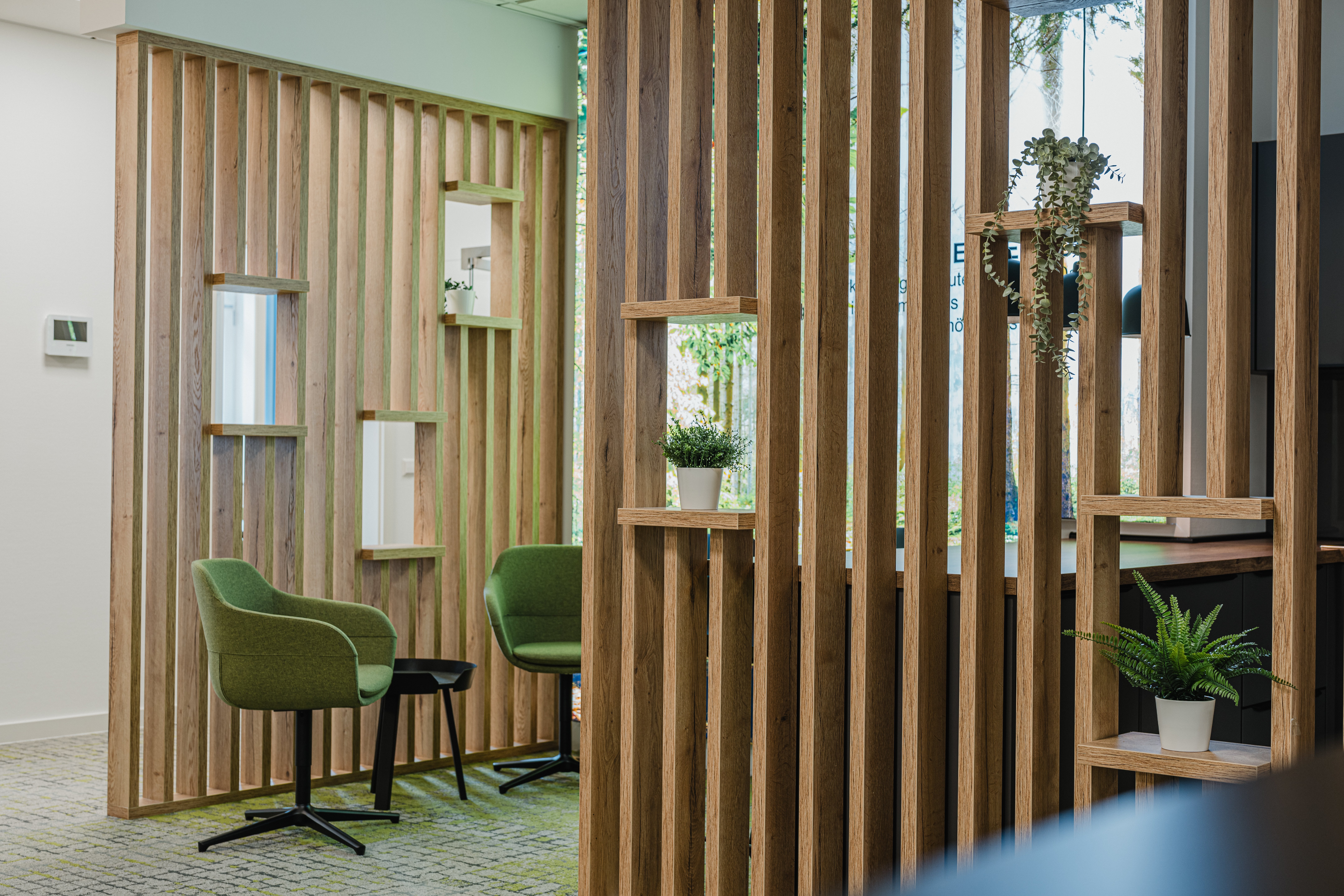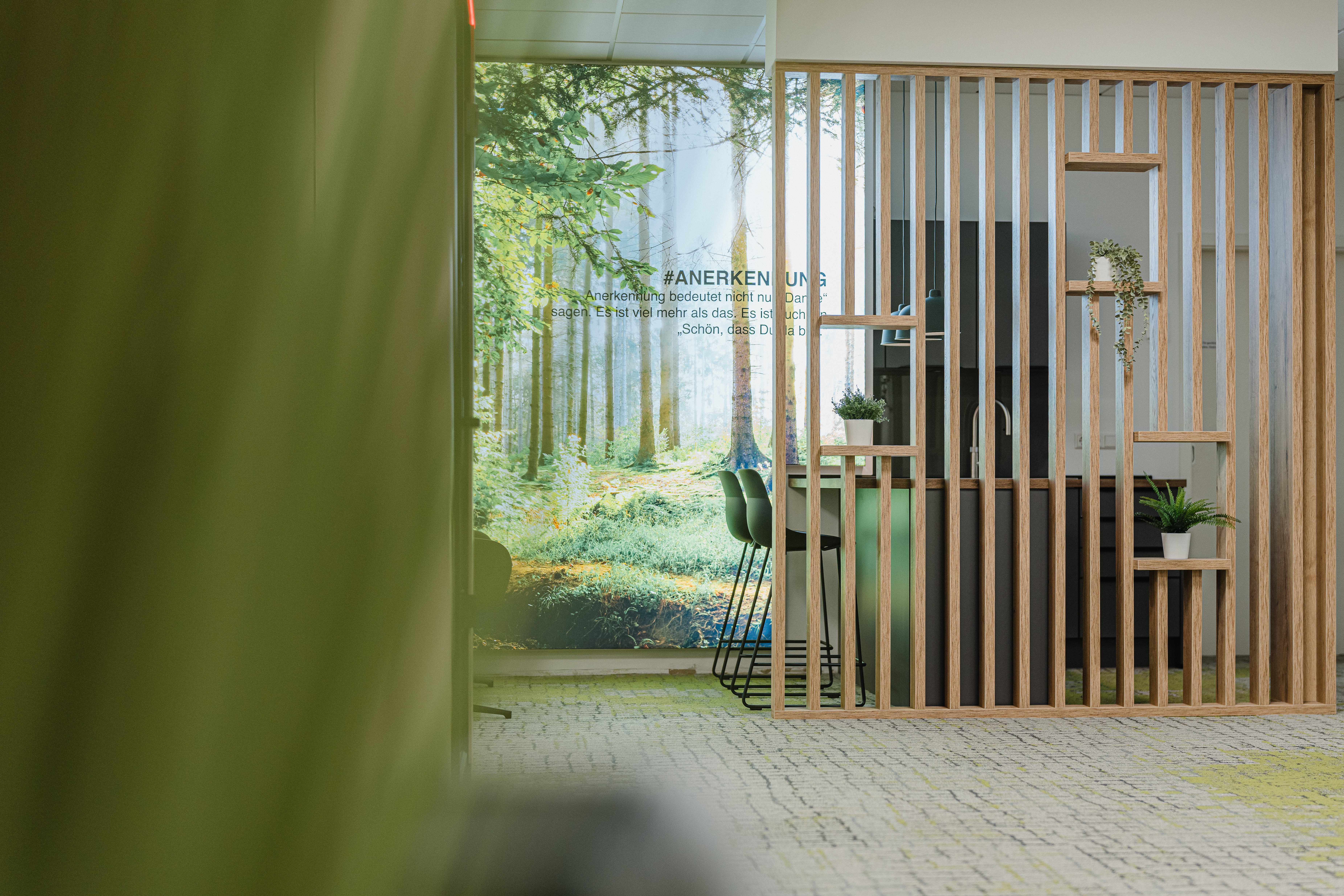 Durch unseren ganzheitlichen 360°-Ansatz haben wir das Problem der Lautstärke in den Büros unseres Kunden nicht nur adressiert, sondern auch effektiv gelöst. Die strategische Zonierung der Arbeitsbereiche, angelehnt an biophiles Design, hat eine deutliche Reduktion von Störgeräuschen und Unterbrechungen bewirkt. Die Einteilung in leise und laute Zonen ermöglicht es allen Mitarbeitenden, je nach Tätigkeit und Bedarf, den optimalen Platz für ihre Arbeit zu finden. Durch die Verwendung von schalldämmenden Materialien und clever platzierten Barrieren in den lauten Bereichen konnten wir eine Atmosphäre schaffen, die sowohl konzentriertes Arbeiten als auch offene Kommunikation fördert.